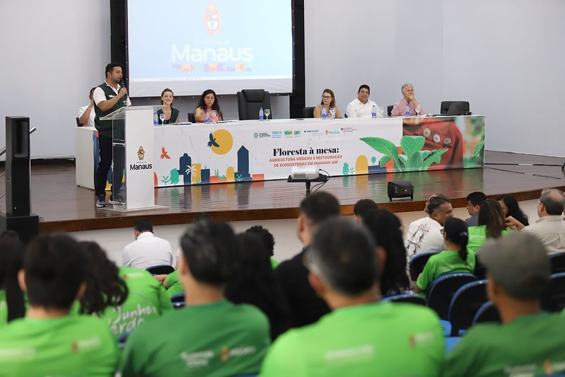 Manaus celebrou o Dia Mundial do Meio Ambiente, nesta quarta-feira, 5/6, com o evento “Floresta à Mesa: agricultura urbana e restauração de ecossistemas em Manaus”, que reuniu representantes do poder público, sociedade civil e instituições nacionais e internacionais no auditório da Prefeitura de Manaus, firmando o compromisso do município no desenvolvimento de um amplo programa de hortas urbanas e periurbanas. Esta é mais uma das iniciativas da gestão, que tem como foco a melhoria da qualidade de vida da população, a redução das ilhas de calor e o incentivo ao desenvolvimento de uma alimentação natural e de qualidade.