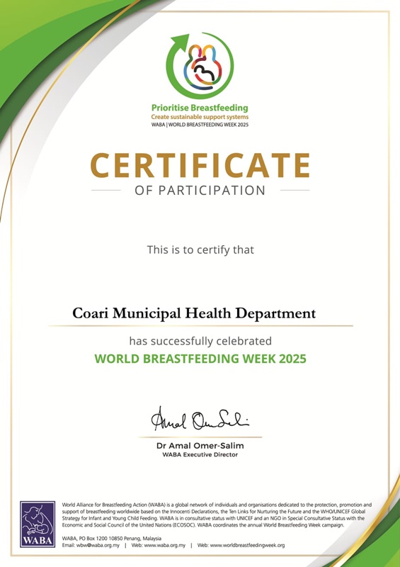 A Prefeitura de Coari, por meio da Secretaria Municipal de Saúde (Semsa), foi reconhecida internacionalmente pela World Alliance for Breastfeeding Action (WABA) pelo trabalho desenvolvido durante o Agosto Dourado, campanha dedicada à promoção e valorização do aleitamento materno.