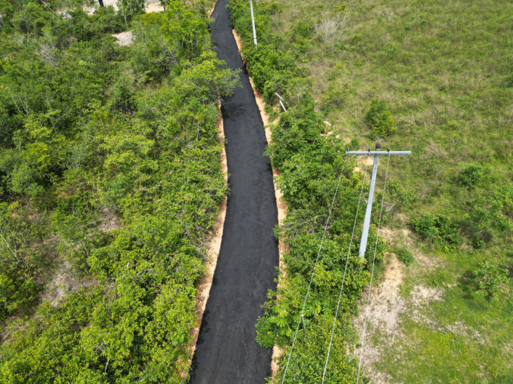 Antes da pavimentação, as equipes realizaram serviços de terraplanagem e nivelamento, utilizando maquinários como motoniveladora, retroescavadeira e rolo pé de carneiro, preparando o solo para receber a camada asfáltica. O trabalho foi concluído com a compactação do asfalto, garantindo resistência e durabilidade ao trecho.