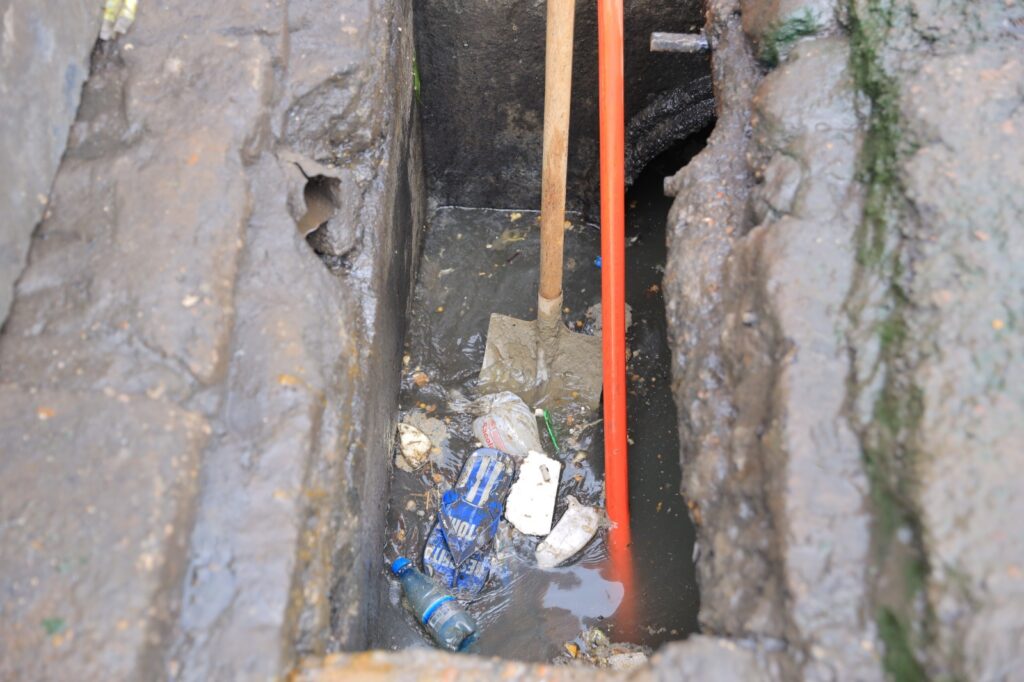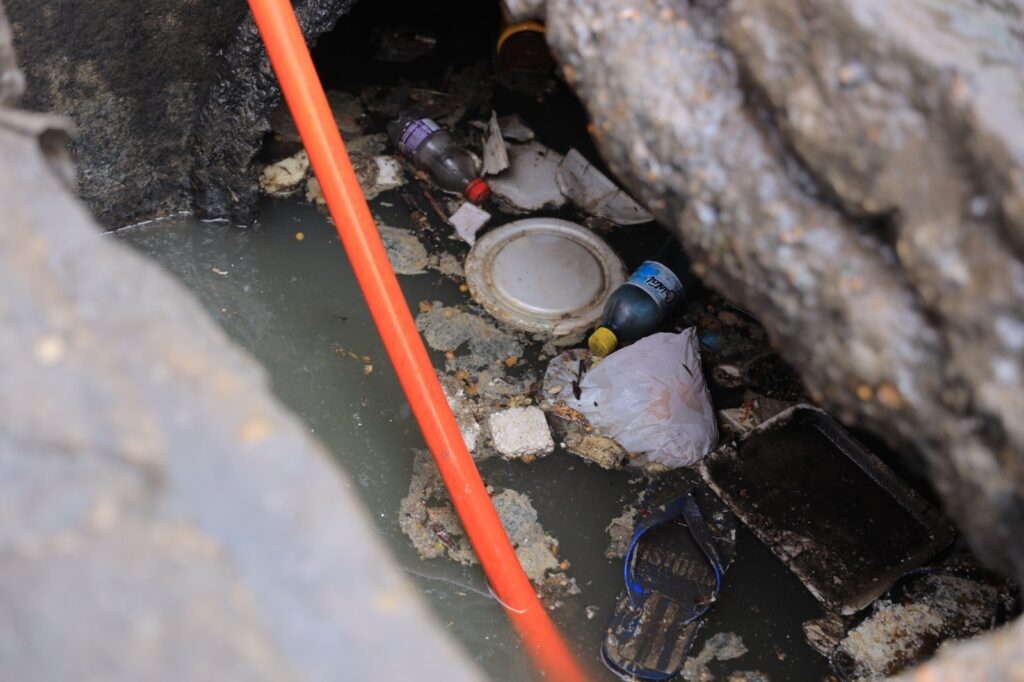 Com o apoio de um caminhão hidrojato, as equipes realizaram a remoção de diversos resíduos de dentro da caixa coletora. Entre os materiais encontrados estavam marmitas, garrafas plásticas e até um par de sandálias. O descarte incorreto desses objetos impede o escoamento adequado das águas das chuvas e compromete o funcionamento da drenagem.