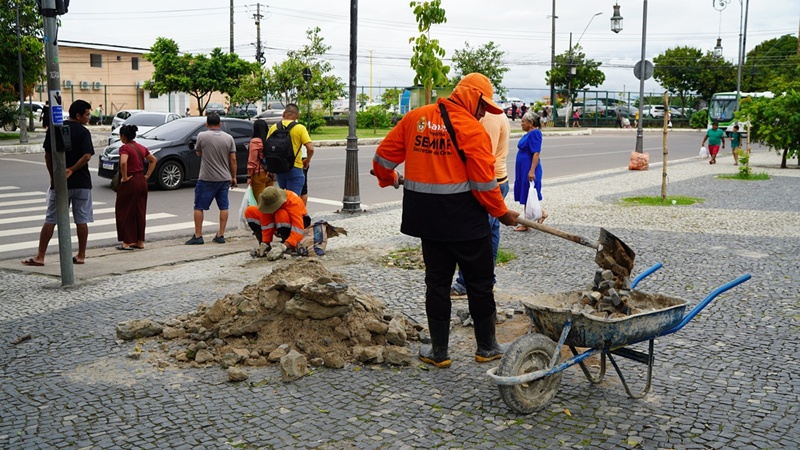 A Prefeitura de Manaus, por meio da Secretaria Municipal de Infraestrutura (Seminf), trabalha, nesta quarta-feira, 30/4, na praça Tenreiro Aranha, entre a avenida Floriano Peixoto e a rua Marcílio Dias, localizadas no Centro, com a revitalização da calçada portuguesa, que um tipo de pavimento feito com pequenos blocos de pedra portuguesa, conhecida por sua durabilidade e resistência, ideal para áreas de alto tráfego, proporcionando mais conforto, segurança e a valorização do espaço urbano.