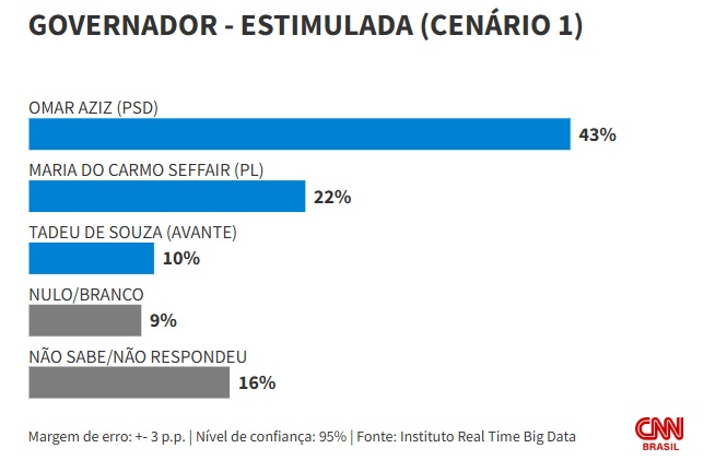 No principal cenário testado, Omar aparece com 43% das intenções de voto, seguido pela empresária Maria do Carmo Seffair (PL) com 22%, e o vice-governador Tadeu de Souza (Avante) com 10%.