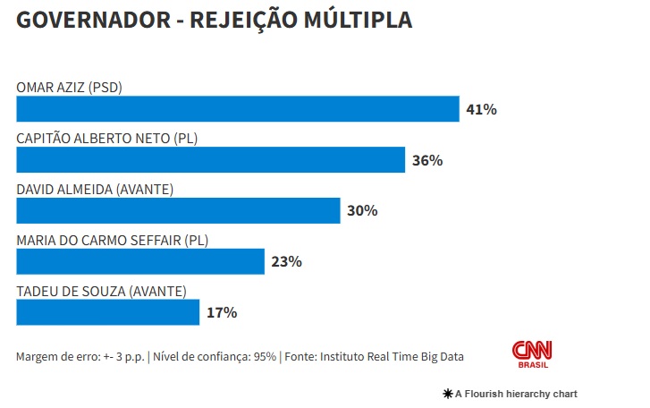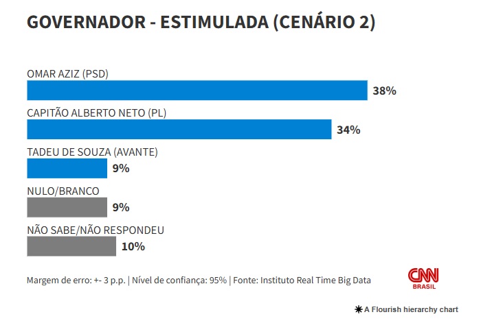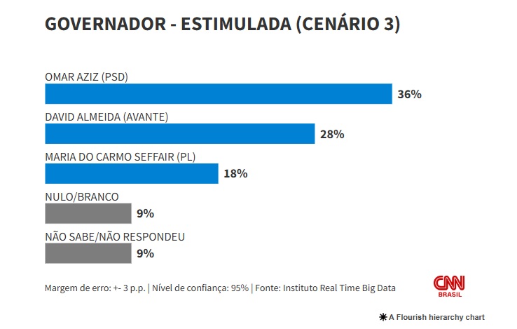 O senador Omar Aziz (PSD-AM) desponta como favorito em pesquisa do instituto Real Time Big Data divulgada nesta sexta-feira (10) com intenções de voto para o governo do Amazonas em 2026. O levantamento, feito a pedido da CNN, ouviu 1.200 eleitores entre os dias 8 e 9 de outubro, com margem de erro de três pontos para mais ou para menos.