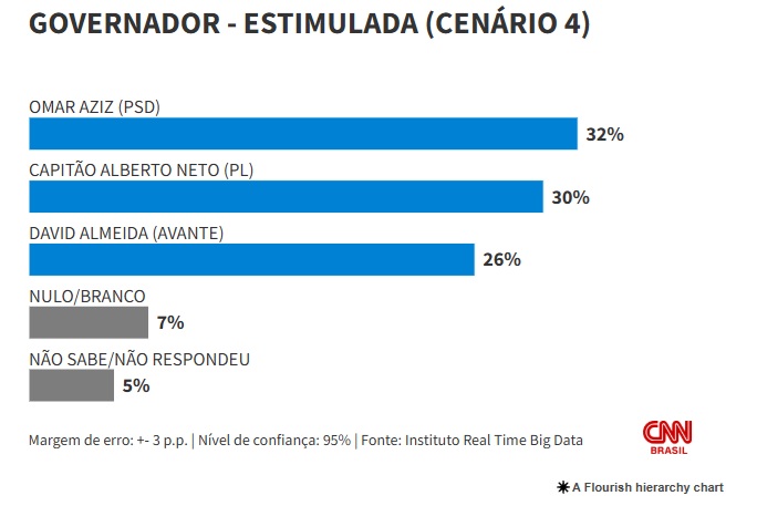 Já no último cenário, Omar Aziz chega a 32%. Na sequência, Capitão Alberto Neto aparece com 30%, enquanto David Almeida apresenta 26%.