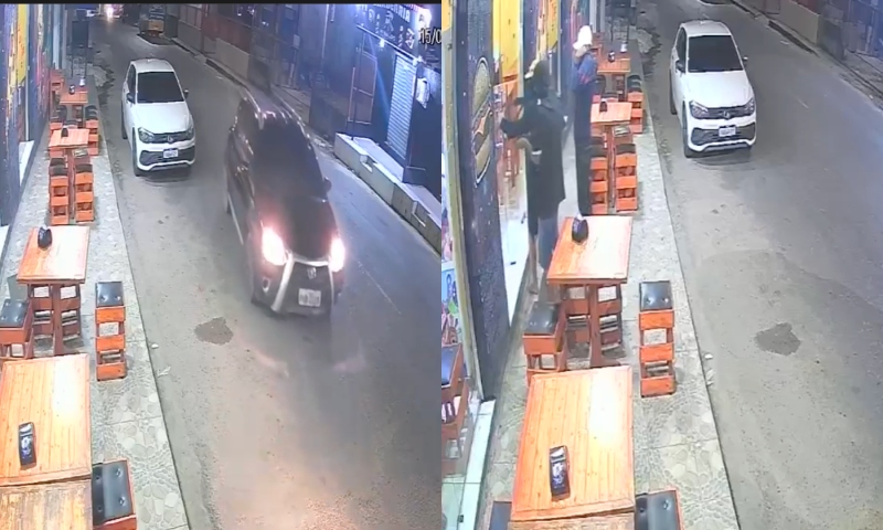 Os três bandidos, usando balaclavas para esconder o rosto, tentam invadir o estabelecimento, mas a porta estava fechada. Eles, então, exibem armas de grande porte e tentam intimidar os funcionários. “Abre, porra! Abre essa merda!”, disse um dos bandidos.