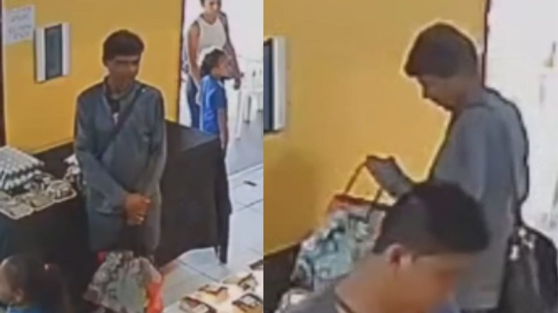 As imagens mostram o suspeito agindo como cliente, observando o ambiente com discrição e, em um movimento rápido, esconde a cartela em uma bolsa.